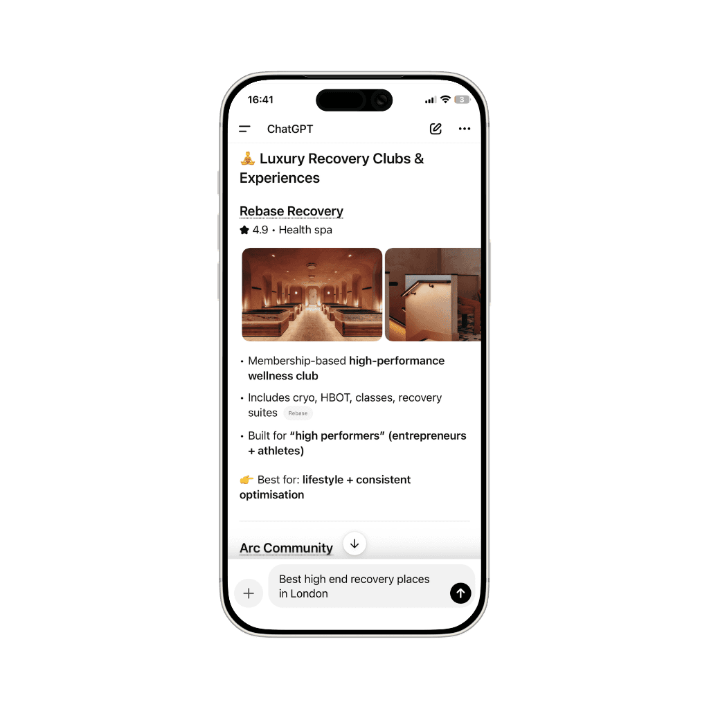 Our client is now recommended by ChatGPT for"high-end recovery spaces in London" and other similar category prompts.