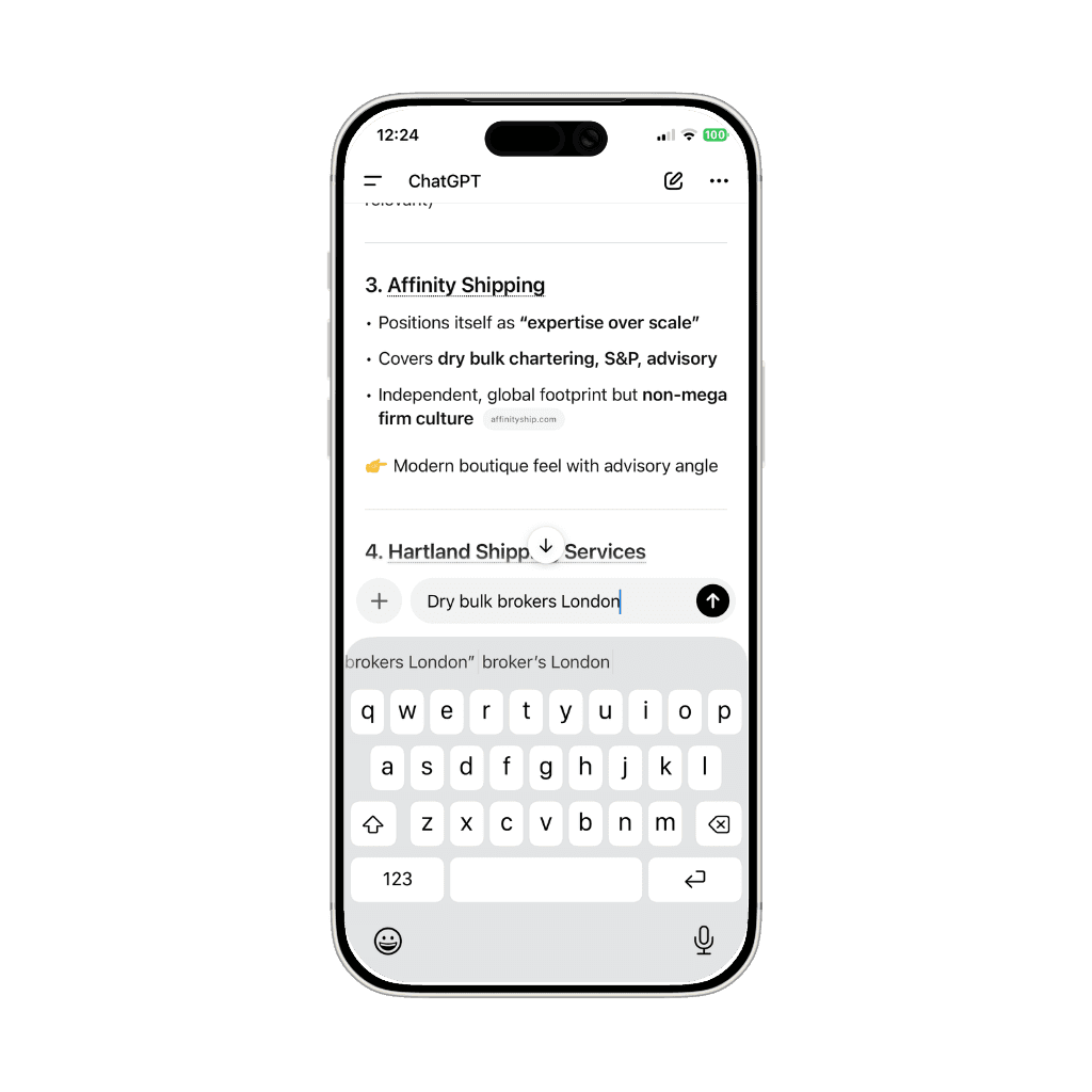 Our client is now recommended by ChatGPT across a range of ship-broking related prompts.
